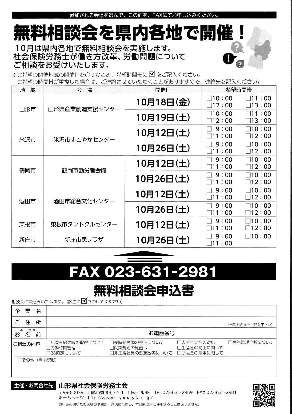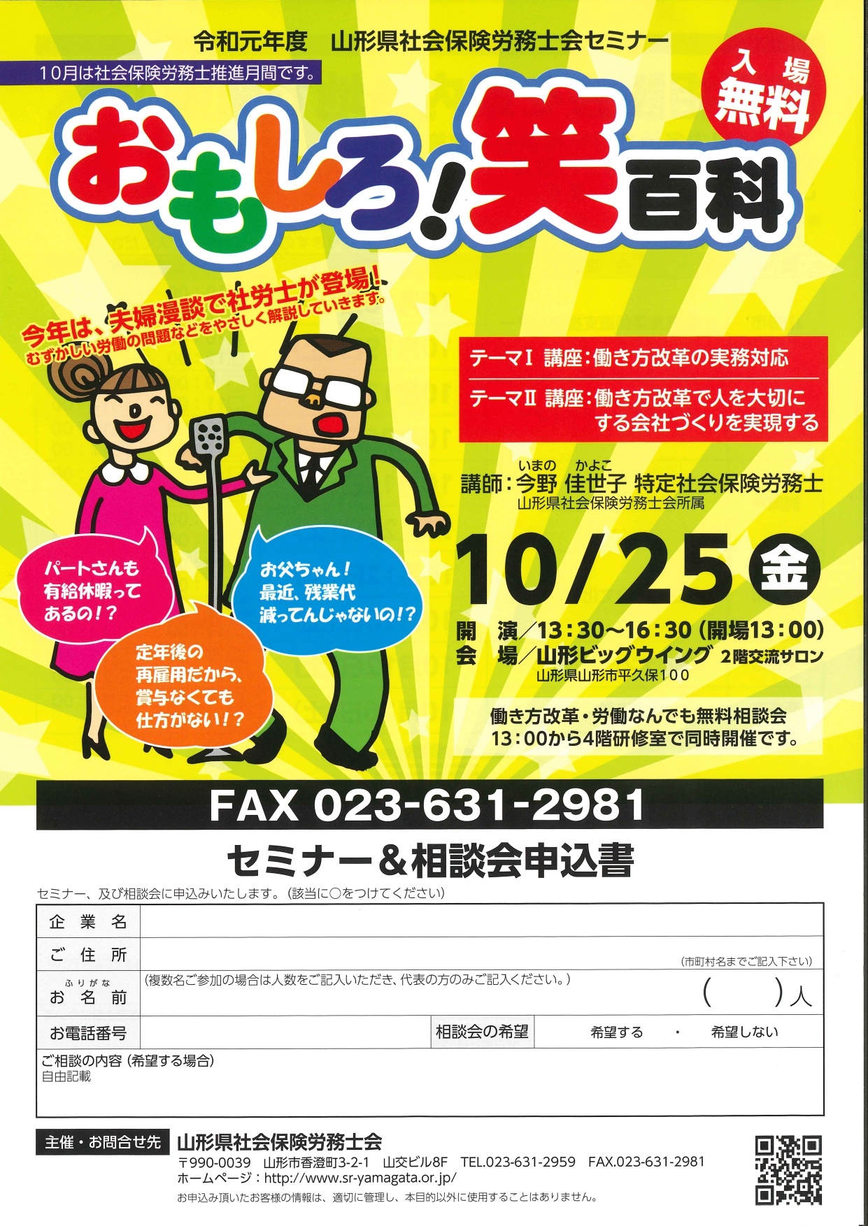 山形ビッグウィングで社労士制度推進月間のセミナーと無料相談会を開催します。